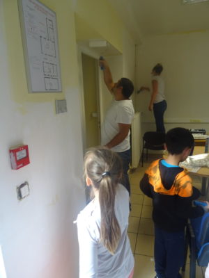 Aujourd’hui on continue d’enduire et de poncer d’un côté, et de peindre de l’autre pour le plus grand plaisir des enfants qui s’éclatent avec les pinceaux et les rouleaux.