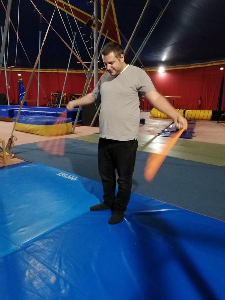 Cours particulier pour Jonathan avec Sosso comme animatrice, séance d’étirements pour commencer puis apprentissage du diabolo, lancer et saut de bolas. Enfin initiation au rolla bolla avec un Jonathan qui excelle encore une fois, alors on complique la technique avec du jongle et un saut sur la planche.