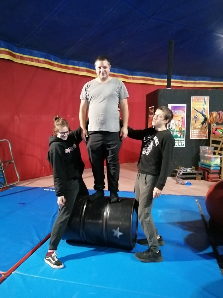 Jonathan s’essaie au tonneau avec plusieurs techniques dont la marche en crabe, le saut et même le jonglage avec les cerceaux.