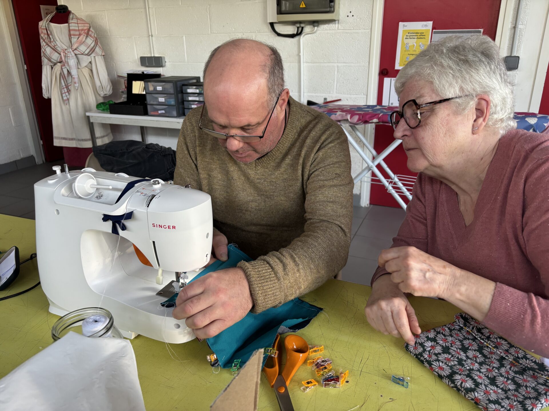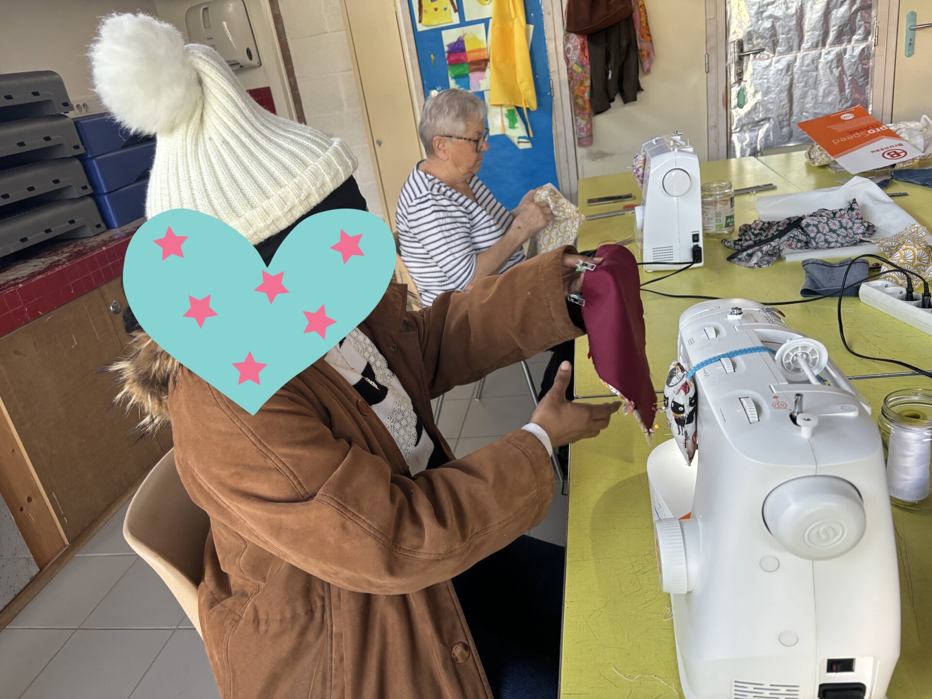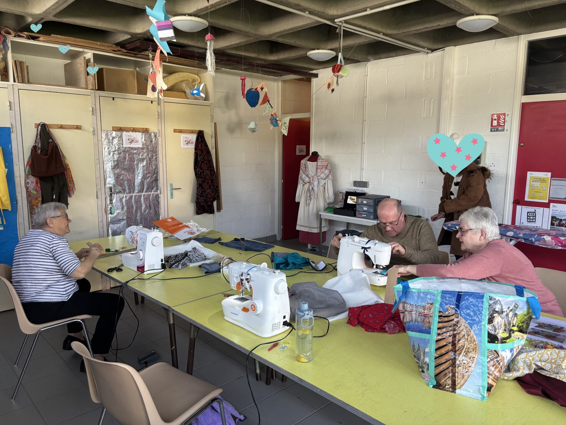 Ce matin, création de pochettes avec fermetures pressions. Elles ne sont pas terminées mais déjà très jolies. Nous avons eu 2 nouveaux participants ce matin et nous espérons les revoir aux prochaines séances. Merci à tous d’être venus et merci à la Maison Jacques Prévert de nous accueillir et de nous prêter ses machines à coudre. C’est grâce à la mutualisation entre centres sociaux que l’on peut réaliser de belles choses.